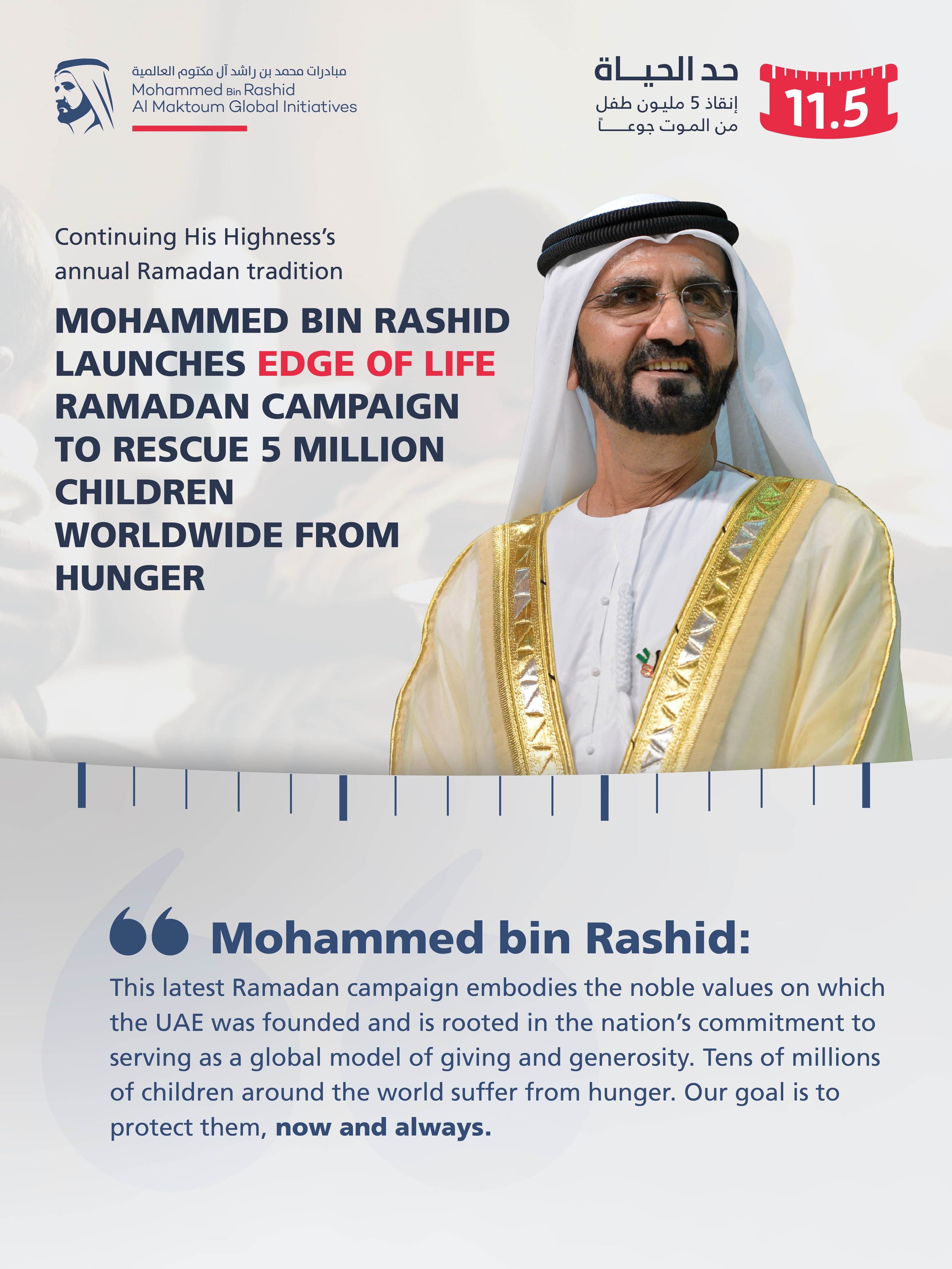 His Highness Sheikh Mohammed bin Rashid Al Maktoum, Vice President, Prime Minister and Ruler of Dubai, launched the "11.5 Edge of Life" campaign, which aims to rescue 5 million children around the world from hunger.